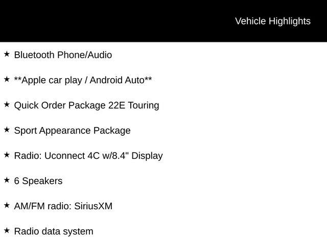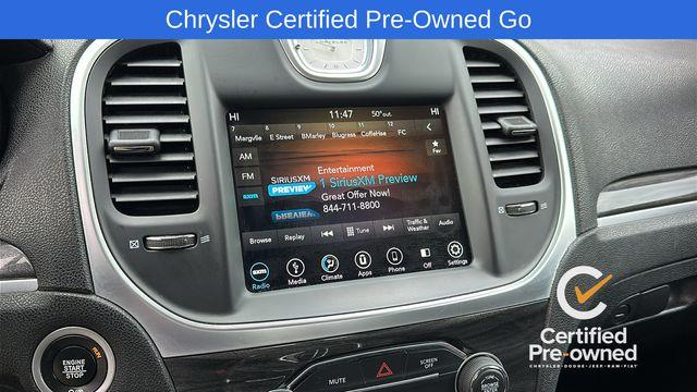 Bluetooth Phone/Audio, **Apple car play / Android Auto**, 4-Wheel Disc Brakes, 6 Speakers, ABS brakes, Alloy wheels, AM/FM radio: SiriusXM, Anti-whiplash front head restraints, Apple CarPlay/Android Auto, Black Chrome Surround 300S Grille, Black Headlamp Bezels, Black LED Taillamps, Brake assist, Bright Chrome Wing Badge - Black Insert, Dual front impact airbags, Dual front side impact airbags, Electronic Stability Control, Emergency communication system: SiriusXM Guardian, Four wheel independent suspension, Front anti-roll bar, Gloss Black DLO Surround Molding, Knee airbag, Low tire pressure warning, Occupant sensing airbag, Overhead airbag, Power driver seat, Power steering, Power windows, Quick Order Package 22E Touring, Radio data system, Radio: Uconnect 4C w/8.4" Display, Rear anti-roll bar, Remote keyless entry, Speed-sensing steering, Speed-Sensitive Wipers, Sport Appearance Package, Steering wheel mounted audio controls, Traction control, Wheels: 20" x 8.0" Aluminum HyperBlack.