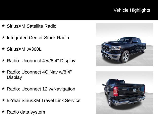 **CAR BRAVO CERTIFIED **, #1 Seat Foam Cushion, 1-Yr SiriusXM Guardian Trial, 10 Speakers, 12" Touchscreen Display, 3 Rear Seat Head Restraints, 3.21 Rear Axle Ratio, 4 Way Front Headrests, 4-Wheel Disc Brakes, 48V Belt Starter Generator, 5-Year SiriusXM Traffic Service, 5-Year SiriusXM Travel Link Service, 8.4" Touchscreen Display, ABS brakes, Adjustable pedals, Air Conditioning, Alloy wheels, AM/FM radio: SiriusXM, Apple CarPlay, Apple CarPlay/Android Auto, Audio memory, Auto High Beam Headlamp Control, Auto-dimming door mirrors, Auto-dimming Rear-View mirror, Automatic temperature control, Blind Spot & Cross Path Detection, Brake assist, Bright Day Light Opening Moldings, Bumpers: chrome, Compass, Delay-off headlights, Disassociated Touchscreen Display, Driver door bin, Driver Seat Memory, Driver vanity mirror, Dual front impact airbags, Dual front side impact airbags, Electronic Stability Control, Foam Bottle Insert (Door Trim Panel), For Details, Visit DriveUconnect.com, Front anti-roll bar, Front Center Armrest w/Storage, Front dual zone A/C, Front fog lights, Front reading lights, Front Seat Back Map Pockets, Front wheel independent suspension, Fully automatic headlights, Garage door transmitter, Google Android Auto, GPS Antenna Input, GPS Navigation, harman/kardon 19 Speaker Premium Sound, HD Radio, Heated door mirrors, Heated Front Seats, Heated front seats, Heated Second Row Seats, Heated Steering Wheel, Heated steering wheel, Illuminated entry, Integrated Center Stack Radio, Laramie Level 2 Equipment Group, Leather steering wheel, Leather Trim 40/20/40 Bench Seat, Low tire pressure warning, Memory seat, No Satellite Coverage w/HI/AK/PR/VI/GU, Occupant sensing airbag, Outside temperature display, Overhead airbag, Overhead console, Panic alarm, ParkSense Front/Rear Park Assist w/Stop, ParkView Rear Back-Up Camera, Passenger door bin, Passenger vanity mirror, Pedal memory, Power 4-Way Driver Lumbar Adjust, Power 4-Way Passenger Lumbar Adjust, Power 8-Way Driver & Passenger Seats, Power door mirrors, Power driver seat, Power passenger seat, Power Running Boards, Power steering, Power windows, Quick Order Package 23H Laramie, Radio data system, Radio: Uconnect 12 w/Navigation, Radio: Uconnect 4 w/8.4" Display, Radio: Uconnect 4C Nav w/8.4" Display, Rain Sensitive Windshield Wipers, Rear 60/40 Folding Split Recline Seat, Rear anti-roll bar, Rear seat center armrest, Rear step bumper, Rear Underseat Compartment Storage, Rear window defroster, Remote keyless entry, Remote Tailgate Release, Security system, Single Disc Remote CD Player, SiriusXM Satellite Radio, SiriusXM Traffic Plus, SiriusXM Travel Link, SiriusXM w/360L, Speed control, Split folding rear seat, Steering wheel mounted audio controls, Tachometer, Tailgate Ajar Warning Lamp, Telescoping steering wheel, Tilt steering wheel, Traction control, Trip computer, Turn signal indicator mirrors, USB Host Flip, Variably intermittent wipers, Ventilated Front Seats, Ventilated front seats, Voltmeter, Wheels: 18" x 8" Aluminum Base Painted, Wheels: 20" x 9" Premium Paint/Polished, Wireless Charging Pad.