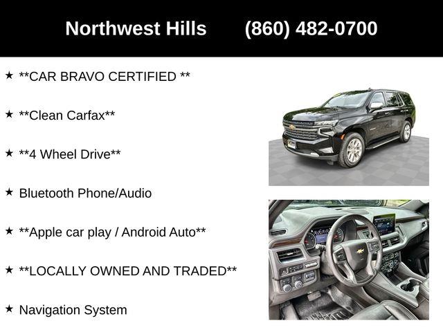 **CAR BRAVO CERTIFIED **, **Clean Carfax**, **4 Wheel Drive**, Bluetooth Phone/Audio, **Apple car play / Android Auto**, **LOCALLY OWNED AND TRADED**, Tahoe Premier, 4D Sport Utility, EcoTec3 5.3L V8, 10-Speed Automatic with Overdrive, 4WD, Black, Jet Black Leather, 10 Speakers, 12-Way Power Driver & Passenger Seat Adjusters, 15" Diagonal Multi-Color Head-Up Display, 1st & 2nd Row Color-Keyed Carpeted Floor Mats, 2 USB Data Ports, 2-Speed Active Electronic AutoTrac Transfer Case, 20" x 9" Polished Aluminum Wheels, 2nd Row Pwr Release 60/40 Split-Folding Bench Seat, 3.23 Rear Axle Ratio, 3rd Row 60/40 Power-Folding Split-Bench Seat, 3rd row seats: split-bench, 4-Wheel Disc Brakes, ABS brakes, Adaptive suspension, Advanced Trailering Package, Advanced Trailering System, Air Conditioning, Alloy wheels, AM/FM radio: SiriusXM with 360L, Apple CarPlay/Android Auto, Auto High-beam Headlights, Auto-dimming door mirrors, Auto-Dimming Inside Rear-View Mirror, Auto-dimming Rear-View mirror, Auto-leveling suspension, Automatic Heated Steering Wheel, Automatic temperature control, Bose 10-Speaker Centerpoint Surround Audio Sys Ft, Brake assist, Bright Front & Rear Door Sill Plates, Bumpers: body-color, Chrome Door Handles w/Body-Color Strip, Chrome Mirror Caps, Color-Keyed Carpeting Floor Covering, Compass, Delay-off headlights, Driver & Front Outboard Passenger Airbags, Driver door bin, Driver vanity mirror, Dual Exhaust System, Dual front impact airbags, Dual front side impact airbags, Electronic Stability Control, Emergency communication system: OnStar and Chevrolet connected services capable, Enhanced Display & Alert Package, Enhanced Driver Information Center, Extra Capacity Cooling System, Floor Console w/Storage Area, Four wheel independent suspension, Front & Rear Park Assist, Front anti-roll bar, Front Bucket Seats, Front Center Armrest, Front dual zone A/C, Front High-Back Reclining Bucket Seats, Front reading lights, Fully automatic headlights, Garage door transmitter, Hands-Free Rear Power Programmable Liftgate, HD Radio, HD Surround Vision, Heated & Ventilated Driver & Front Passenger Seats, Heated 2nd Row Outboard Seats, Heated door mirrors, Heated Driver & Front Passenger Seats, Heated front seats, Heated rear seats, Heated steering wheel, Hill Descent Control, Hitch Guidance w/Hitch View, Illuminated entry, Infotainment Display, Inside Rearview Auto-Dimming Rear Camera Mirror, Integrated Trailer Brake Controller, Lane Change Alert w/Side Blind Zone Alert, Lane Keep Assist w/Lane Departure Warning, Leather steering wheel, Leather-Wrapped Steering Wheel, LED Daytime Running Lamps, License Plate Front Mounting Package, Low tire pressure warning, Magnetic Ride Control Suspension, Max Trailering Package, Memory seat, Memory Settings, Navigation System, Occupant sensing airbag, Outside Heated Power-Adjustable Mirrors, Outside temperature display, Overhead airbag, Overhead console, Panic alarm, Passenger door bin, Passenger vanity mirror, Perforated Leather Seat Trim, Power door mirrors, Power driver seat, Power Liftgate, Power passenger seat, Power Release 2nd Row Bucket Seats, Power steering, Power Tilt & Telescopic Steering Column, Power windows, Preferred Equipment Group 1LZ, Premium audio system: Chevrolet Infotainment 3, Radio: Chevrolet Infotainment 3 Premium System, Rain sensing wipers, Rear air conditioning, Rear anti-roll bar, Rear Camera Mirror Washer, Rear Cross Traffic Alert, Rear Pedestrian Alert, Rear reading lights, Rear window defroster, Rear window wiper, Remote keyless entry, Remote Start, Roof rack: rails only, Safety Alert Seat, Security system, Set of 4 Wheel Locks (LPO), SiriusXM NavTraffic, SiriusXM Radio w/360L, Speed control, Speed-sensing steering, Split folding rear seat, Spoiler, Steering wheel memory, Steering wheel mounted audio controls, Tachometer, Telescoping steering wheel, Tilt steering wheel, Traction control, Trailer Side Blind Zone Alert, Trip computer, Tur