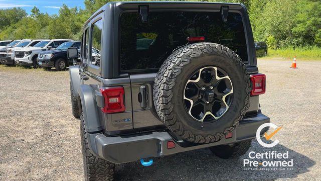 **Certified**, **Clean Carfax**, **4 Wheel Drive**, Bluetooth Phone/Audio, **Apple car play / Android Auto**, Wrangler Unlimited Rubicon 4xe, 4D Sport Utility, 2.0L I4 DOHC, 8-Speed Automatic, 4WD, Black Cloth, 4-Wheel Disc Brakes, 4.10 Rear Axle Ratio, 9 Speakers, ABS brakes, Air Conditioning, Alloy wheels, AM/FM radio: SiriusXM, Apple CarPlay/Android Auto, Auto-dimming Rear-View mirror, Automatic temperature control, Black 3-Piece Hard Top, Brake assist, Cold Weather Group, Compass, Delay-off headlights, Driver door bin, Driver vanity mirror, Dual front impact airbags, Dual front side impact airbags, Electronic Stability Control, Emergency communication system: SiriusXM Guardian, Freedom Panel Storage Bag, Front anti-roll bar, Front Bucket Seats, Front Center Armrest w/Storage, Front dual zone A/C, Front fog lights, Front License Plate Bracket, Front reading lights, Fully automatic headlights, Garage door transmitter, Heated door mirrors, Heated Front Seats, Heated Steering Wheel, Illuminated entry, Integrated roll-over protection, Leather steering wheel, Low tire pressure warning, Navigation System, No Soft Top, Occupant sensing airbag, Outside temperature display, Panic alarm, ParkView Rear Back-Up Camera, Passenger door bin, Passenger vanity mirror, Performance Suspension, Power door mirrors, Power steering, Power windows, Premium Cloth Low-Back Bucket Seats, Quick Order Package 29V, Radio data system, Radio: Uconnect 4C Nav w/8.4" Display, Rear anti-roll bar, Rear reading lights, Rear Window Defroster, Rear Window Wiper/Washer, Remote keyless entry, Remote Start System, Security system, Speed control, Split folding rear seat, Steering wheel mounted audio controls, Tachometer, Telescoping steering wheel, Tilt steering wheel, Traction control, Trip computer, Variably intermittent wipers, Voltmeter, Wheels: 17" x 7.5" Machined/Painted Black.