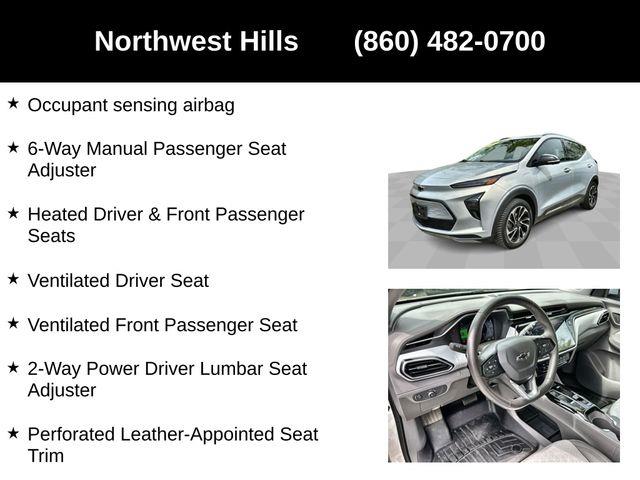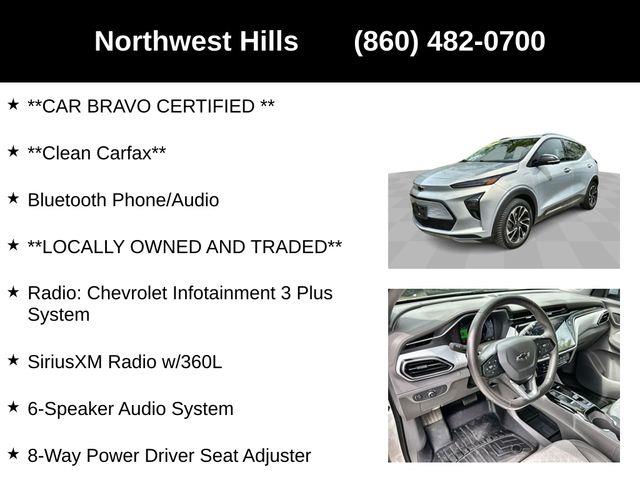 **CAR BRAVO CERTIFIED **, **Clean Carfax**, Bluetooth Phone/Audio, **LOCALLY OWNED AND TRADED**, Bolt EUV Premier, Electric Motor, 1-Speed Automatic, FWD, Silver Flare Metallic, Dark Ash Gray Sky Gray Leather, 2-Way Power Driver Lumbar Seat Adjuster, 4-Wheel Disc Brakes, 6-Speaker Audio System, 6-Way Manual Passenger Seat Adjuster, 8-Way Power Driver Seat Adjuster, ABS brakes, Dual front impact airbags, Dual front side impact airbags, Emergency communication system: OnStar and Chevrolet connected services capable, Front anti-roll bar, Front Center Armrest, Front wheel independent suspension, Heated Driver & Front Passenger Seats, Heated front seats, Heated rear seats, Knee airbag, Low tire pressure warning, Occupant sensing airbag, Overhead airbag, Perforated Leather-Appointed Seat Trim, Power driver seat, Power steering, Power windows, Radio: Chevrolet Infotainment 3 Plus System, Rain sensing wipers, Rear side impact airbag, Rear window wiper, Remote keyless entry, SiriusXM Radio w/360L, Split folding rear seat, Steering wheel mounted audio controls, Variably intermittent wipers, Ventilated Driver Seat, Ventilated Front Passenger Seat, Ventilated front seats.