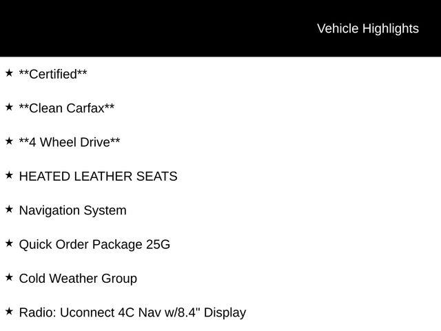 **Certified**, **Clean Carfax**, **4 Wheel Drive**, HEATED LEATHER SEATS, 4D Sport Utility, 3.6L V6 24V VVT, 8-Speed Automatic, 4WD, Hydro Blue Pearl Coat, Black Leather, 3.45 Rear Axle Ratio, 4-Wheel Disc Brakes, ABS brakes, Blind Spot & Cross Path Detection, Brake assist, Cloth Low-Back Bucket Seats, Cold Weather Group, Dual front impact airbags, Dual front side impact airbags, Electronic Stability Control, Emergency communication system: SiriusXM Guardian, Front anti-roll bar, Front Bucket Seats, Heated Front Seats, Heated Steering Wheel, Heavy Duty Suspension w/Gas Shocks, Integrated roll-over protection, Low tire pressure warning, Navigation System, Occupant sensing airbag, ParkSense Rear Park Assist System, ParkView Rear Back-Up Camera, Power steering, Power windows, Quick Order Package 25G, Radio: Uconnect 4C Nav w/8.4" Display, Rear anti-roll bar, Remote keyless entry, Remote Start System, Speed control, Steering wheel mounted audio controls, Traction control.