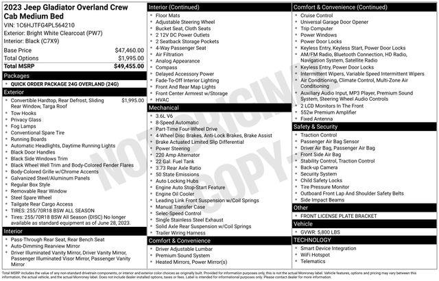 Standard Equipments on 2023 Jeep Gladiator Overland in Avon, CT