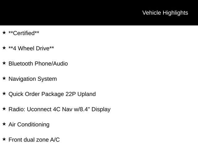 **Certified**, **4 Wheel Drive**, Bluetooth Phone/Audio, 1.3L I4, Black/Bronze Cloth, 4-Wheel Disc Brakes, ABS brakes, Air Conditioning, Alloy wheels, Ambient LED Interior Lighting, Anti-whiplash front head restraints, Automatic Headlamps, Automatic temperature control, Black Side Roof Rails, Brake assist, Cluster 7" TFT Color Display, Compass, Cornering Front Fog Lamps, Dual front impact airbags, Dual front side impact airbags, Electronic Stability Control, Emergency communication system: SiriusXM Guardian, Exterior Mirrors w/Supplemental Signals, Front anti-roll bar, Front dual zone A/C, Heated door mirrors, Hood Decal, Illuminated entry, Keyless Entry w/Panic Alarm, Knee airbag, Leather Wrapped Shift Knob, Low tire pressure warning, Navigation System, Occupant sensing airbag, Overhead airbag, ParkView Rear Back-Up Camera, Premium Cloth Low-Back Bucket Seats, Quick Order Package 22P Upland, Radio: Uconnect 4C Nav w/8.4" Display, Rear window wiper, Remote keyless entry, Remote Start System, Traction control, Upgraded Exterior Color Mirror, Upland Edition, Variably intermittent wipers, Wheels: 17" x 7" Glossy Black Diamond Cut, Windshield Wiper De-Icer.