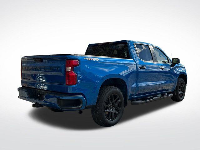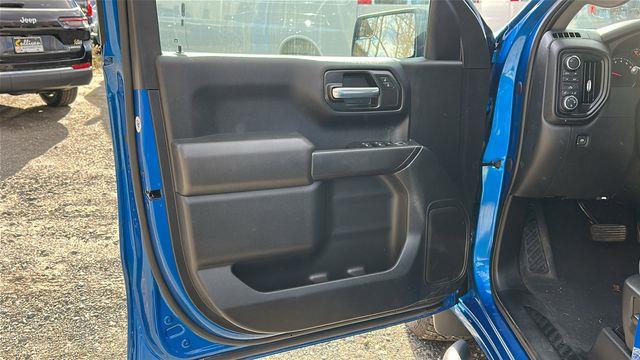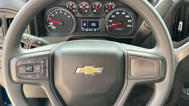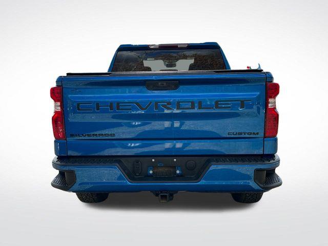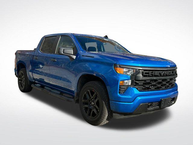**Clean Carfax**, **4 Wheel Drive**, Bluetooth Phone/Audio, Silverado 1500 Custom, 4D Crew Cab, 2.7L I4 Turbocharged DOHC 16V LEV3-SULEV30 310hp, 8-Speed Automatic, 4WD, Glacier Blue Metallic, Black Cloth, 10-Way Power Driver Seat w/Lumbar, 120-Volt Bed Mounted Power Outlet, 120-Volt Interior Power Outlet, 3.42 Rear Axle Ratio, 3.5" Monochromatic Display Driver Info Center, 4-Wheel Disc Brakes, 4" Black Round Assist Steps (LPO), 40/20/40 Front Split-Bench Seat, 6 Speakers, 6-Speaker Audio System, ABS brakes, Air Conditioning, Alloy wheels, AM/FM radio: SiriusXM, Auto High-beam Headlights, Automatic Emergency Braking, Black Name Plates (LPO), Black Tailgate CHEVROLET Lettering (LPO), Bluetooth® For Phone, Bumpers: body-color, Chevrolet Connected Access Capable, Cloth Seat Trim, Color-Keyed Carpeting Floor Covering, Compass, Custom Convenience Package, Custom Value Package, Dark Essentials Package (LPO), Deep-Tinted Glass, Delay-off headlights, Driver door bin, Driver vanity mirror, Dual front impact airbags, Dual front side impact airbags, Dual Rear USB Ports (Charge Only), Electric Rear-Window Defogger, Electrical Steering Column Lock, Electronic Cruise Control, Electronic Stability Control, EZ Lift Power Lock & Release Tailgate, Following Distance Indicator, Forward Collision Alert, Front anti-roll bar, Front Black Bowtie Emblem (LPO), Front Center Armrest w/Storage, Front Frame-Mounted Black Recovery Hooks, Front License Plate Kit, Front Pedestrian Braking, Front reading lights, Front Rubberized Vinyl Floor Mats, Front wheel independent suspension, Fully automatic headlights, HD Rear Vision Camera, Heated door mirrors, High Capacity Suspension Package, Hitch Guidance, Illuminated entry, IntelliBeam Automatic High Beam On/Off, Lane Keep Assist w/Lane Departure Warning, LED Cargo Area Lighting, Low tire pressure warning, Manual Tilt Wheel Steering Column, Occupant sensing airbag, OnStar & Chevrolet Connected Services Capable, Outside temperature display, Overhead airbag, Overhead console, Panic alarm, Passenger door bin, Passenger vanity mirror, Power door mirrors, Power driver seat, Power Front Windows w/Driver Express Up/Down, Power Front Windows w/Passenger Express Down, Power Rear Windows w/Express Down, Power steering, Power windows, Preferred Equipment Group 1CX, Premium audio system: Chevrolet Infotainment 3, Premium Soft Roll-Up Tonneau Cover (LPO), Radio data system, Radio: Chevrolet Infotainment 3 System, Rear 60/40 Folding Bench Seat (Folds Up), Rear reading lights, Rear step bumper, Rear window defroster, Remote Keyless Entry, Remote keyless entry, Remote Vehicle Starter System, Security system, Single Outlet Exhaust, SiriusXM Radio, Speed control, Speed-sensing steering, Split folding rear seat, Standard Tailgate, Tachometer, Theft Deterrent System (Unauthorized Entry), Tilt steering wheel, Traction control, Trailering Package, Trip computer, TurboMax Blackout Package, Variably intermittent wipers, Voltmeter, Wheels: 20" x 9" Bright Silver Painted Aluminum, Wheels: 20" x 9" High Gloss Black Painted Alum, Wi-Fi Hot Spot Capable.
