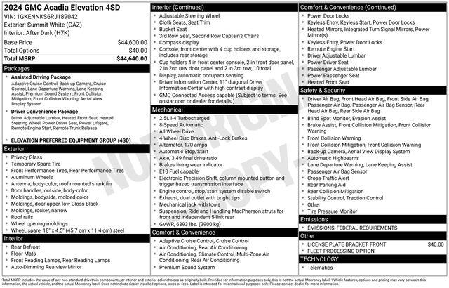 Standard Equipments on 2024 GMC Acadia Elevation in Avon, CT