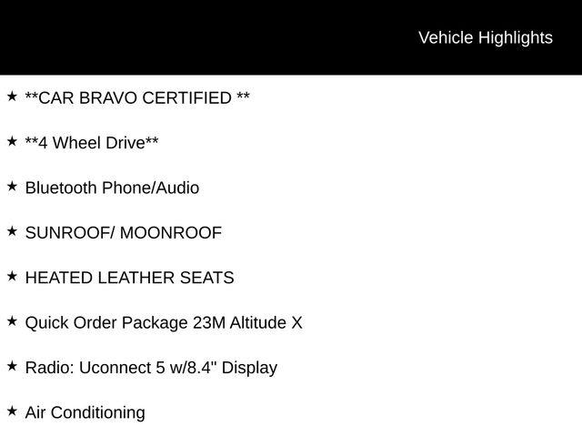 **CAR BRAVO CERTIFIED **, **4 Wheel Drive**, Bluetooth Phone/Audio, SUNROOF/ MOONROOF, HEATED LEATHER SEATS, Grand Cherokee Altitude X, 4D Sport Utility, 3.6L V6 24V VVT, 8-Speed Automatic, 4WD, Diamond Black Crystal Pearlcoat, Global Black Artificial Leather, 115V Auxiliary Power Outlet, 3.45 Rear Axle Ratio, 4-Wheel Disc Brakes, ABS brakes, Air Conditioning, Alloy wheels, Altitude X, Anti-whiplash front head restraints, Automatic temperature control, Black Headliner, Brake assist, Capri Leatherette/Suede Seats, Cloth Seats, Delete Laredo Badge, Dual front impact airbags, Dual front side impact airbags, Electronic Stability Control, Emergency communication system, Front anti-roll bar, Front Bucket Seats, Front Center Armrest w/Storage, Front dual zone A/C, Gloss Black Exterior Accents, Heated Front Seats, Heated Steering Wheel, Knee airbag, Low tire pressure warning, Occupant sensing airbag, Overhead airbag, Passenger door bin, Power driver seat, Power Liftgate, Power steering, Power Sunroof, Power windows, Quick Order Package 23M Altitude X, Radio: Uconnect 5 w/8.4" Display, Rain Sensitive Windshield Wipers, Rear window wiper, Remote keyless entry, Remote Start System, Selectable Tire Fill Alert, Speed-Sensitive Wipers, Split folding rear seat, Variably intermittent wipers, Wheels: 17" x 6.5" Fully Painted Aluminum, Wheels: 18" x 8" Fully Painted Aluminum 1, Wheels: 20" x 8.5" Gloss Black Painted Aluminum, Wireless Charging Pad.