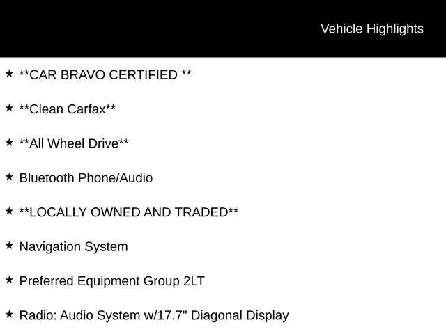 **CAR BRAVO CERTIFIED **, **Clean Carfax**, **All Wheel Drive**, Bluetooth Phone/Audio, **LOCALLY OWNED AND TRADED**, AWD, 3rd row seats: split-bench, 4-Way Manual Front Passenger Seat Adjuster, 4-Wheel Disc Brakes, 6-Speaker Audio System Feature, 8-Way Power Driver Seat Adjuster, ABS brakes, Air Conditioning, Apple CarPlay/Android Auto, Auto High-beam Headlights, Automatic temperature control, Brake assist, Child-Seat-Sensing Airbag, Delay-off headlights, Dual front impact airbags, Dual front side impact airbags, Electronic Stability Control, Emergency communication system: OnStar, Front anti-roll bar, Front Bucket Seats, Front Center Armrest, Front dual zone A/C, Fully automatic headlights, Heated front seats, Low tire pressure warning, Navigation System, Occupant sensing airbag, Overhead airbag, Power driver seat, Power Liftgate, Power steering, Power windows, Preferred Equipment Group 2LT, Rear air conditioning, Rear anti-roll bar, Rear window defroster, Rear window wiper, Remote keyless entry, Steering wheel mounted audio controls, Variably intermittent wipers, Wheels: 18" Grazen Metallic Machined-Face Aluminum.